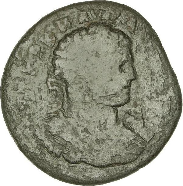 Caracalla standing right, holding patera over altar and spear, facing Apollo-Tyrimnaios standing left, holding branch and double axe |