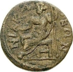 Zeus seated left, holding patera (?) in his extended right hand, left resting on sceptre