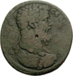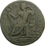 Apollo seated left on a throne ornamented with a laurel branch, holding bow and quiver in right hand, left arm resting on a lyre; at his feet, griffin |