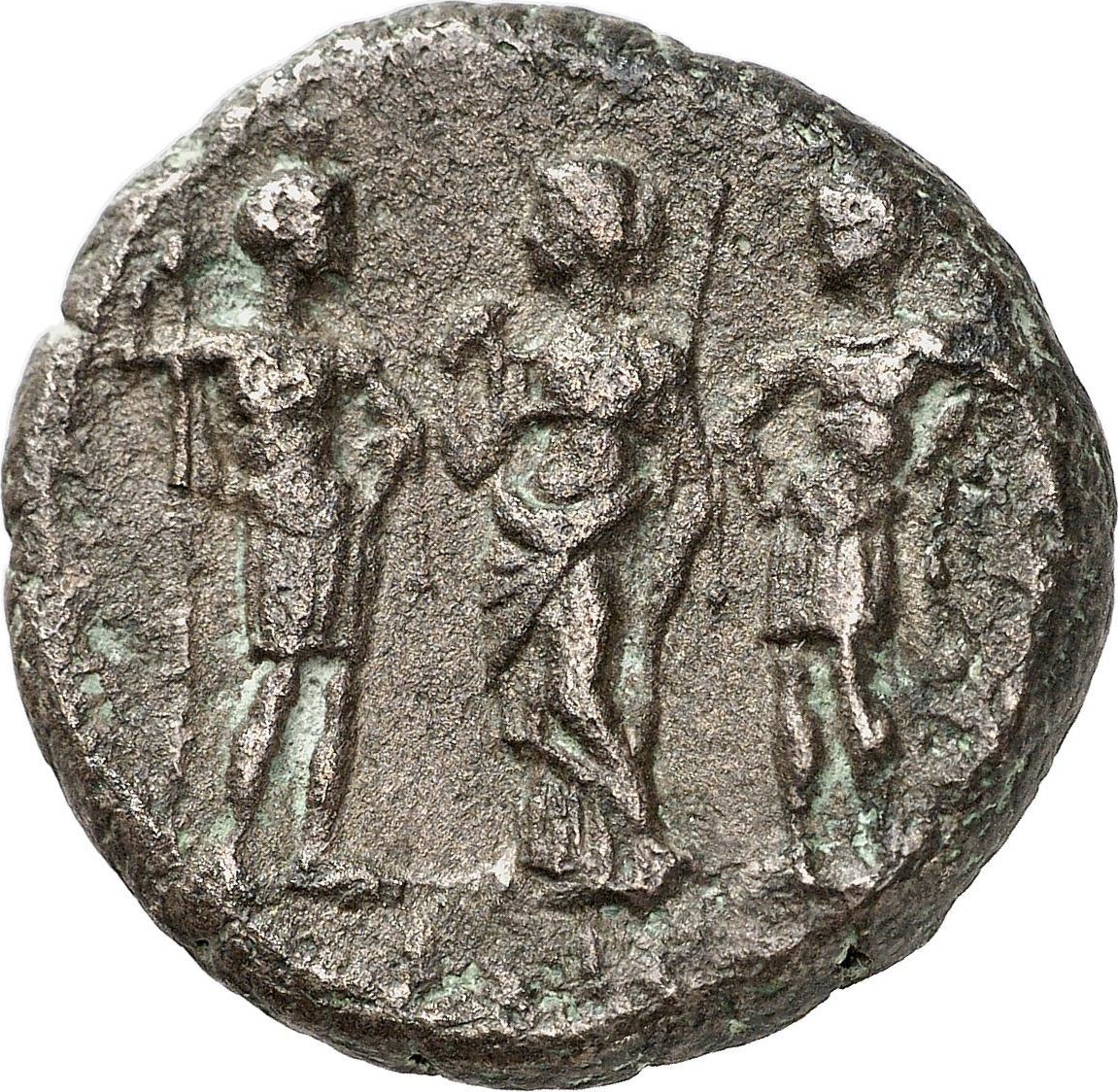 Julia Domna standing facing, head left, between Caracalla and Geta, standing right and left, in military dress and holding spears