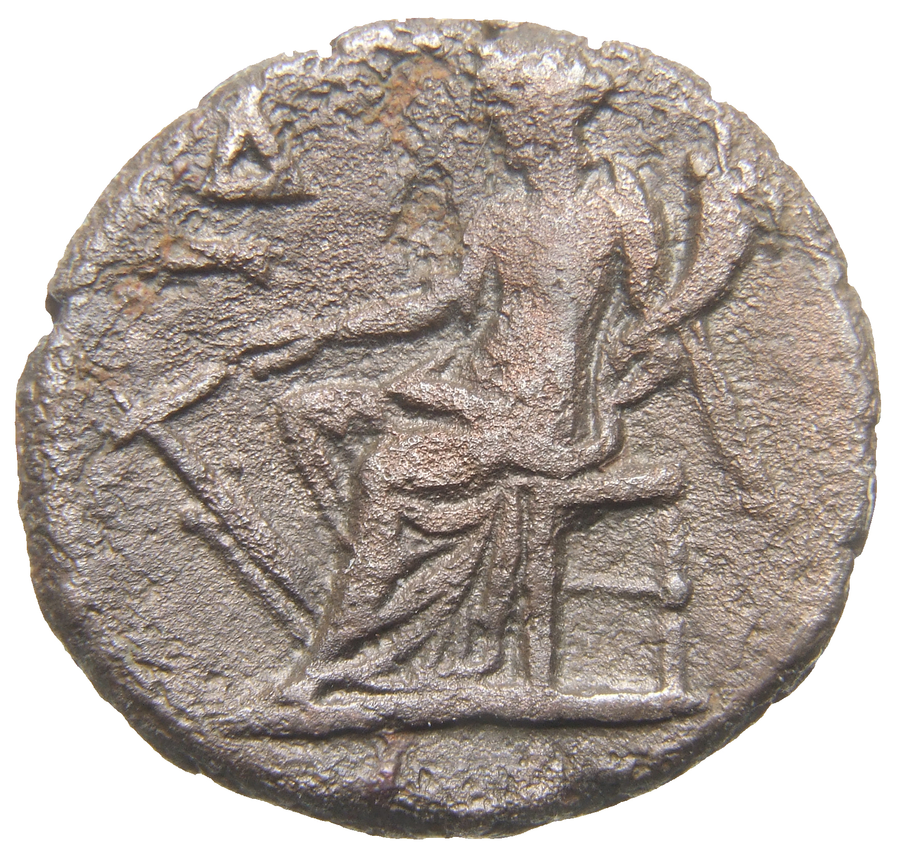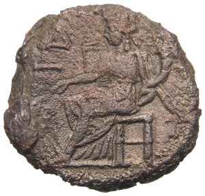 Tyche enthroned left, holding rudder in right hand and cornucopia in left hand