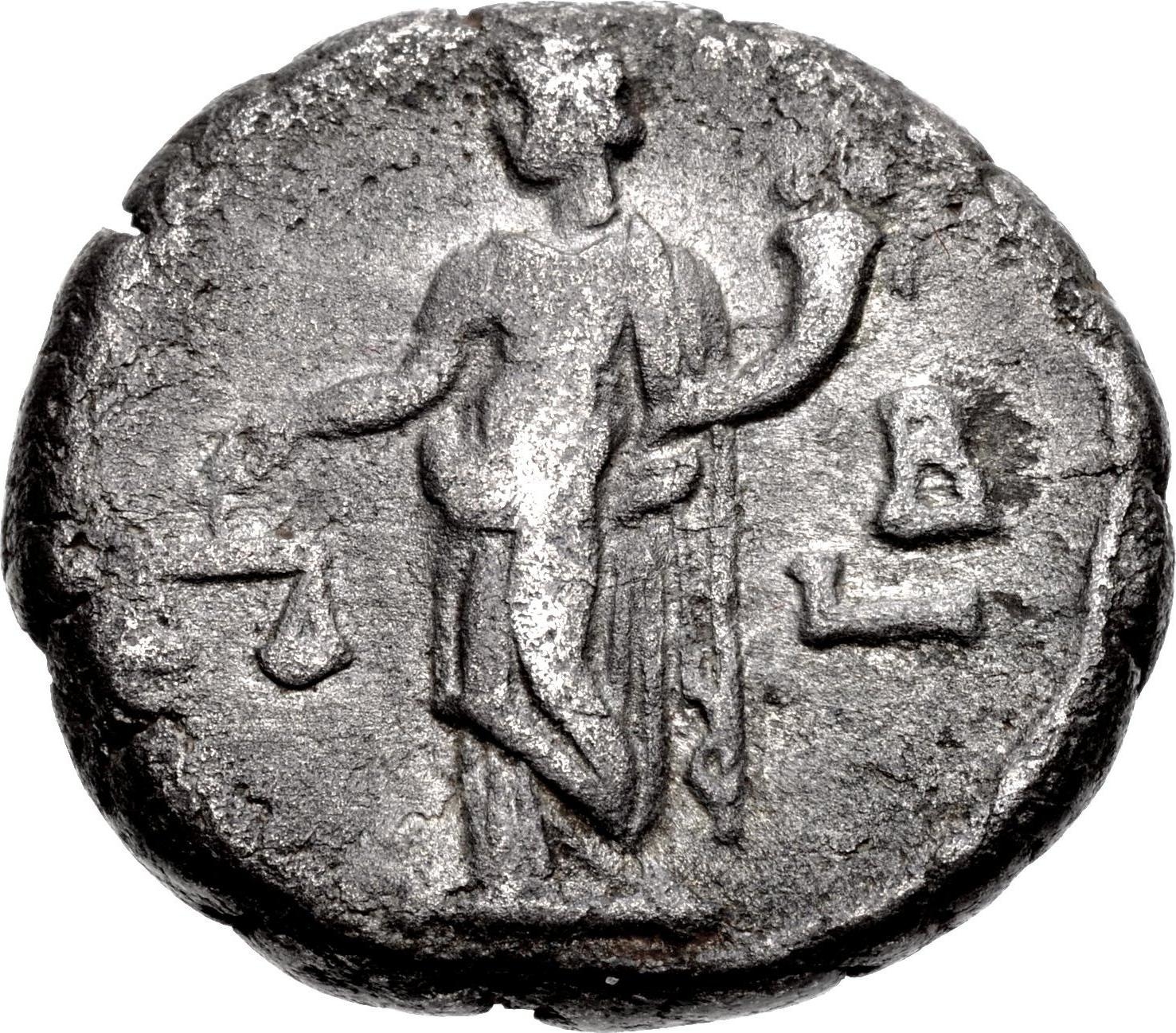 Dikaiosyne standing facing, head left, holding scales in right hand and cornucopia in left