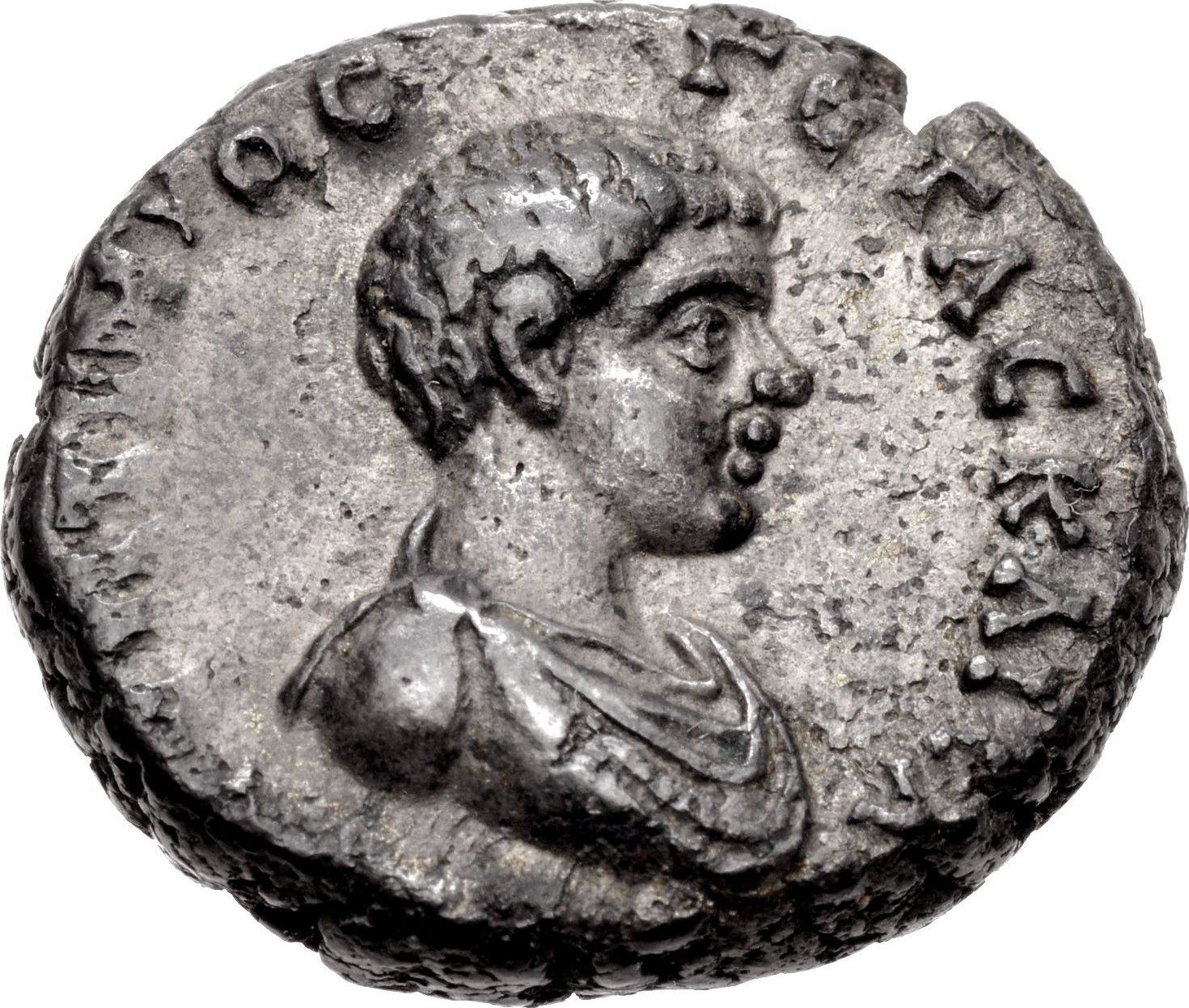 bare-headed, draped and cuirassed bust of Geta, right, seen from front