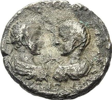 confronted bust of Caracalla, laureate, draped and cuirassed bust, right, seen from rear, and Geta, bare-headed, draped and cuirassed, left, seen from rear