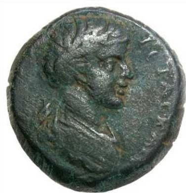 bare-headed, draped and cuirassed bust of Geta, right, seen from rear