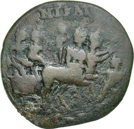 Dionysus and Ariadne in a car drawn by two centaurs; in field, small eros?; at right satyr (?) advancing right, looking back