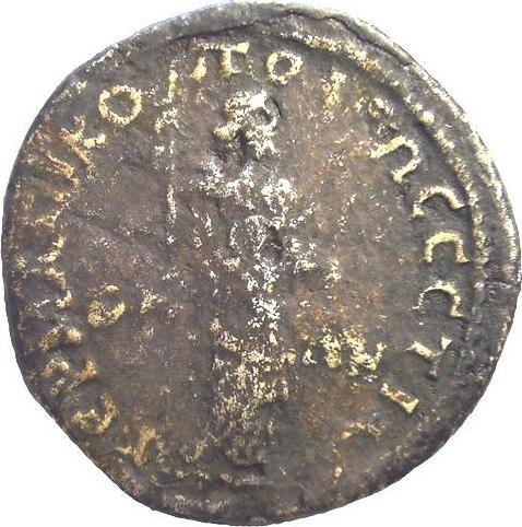 Zeus standing facing, head right, holding sceptre and thunderbolt (?)
