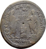Demos of Magnesia standing right, looking left, holding cult statue of Artemis Leukophryene, facing Demos of Ephesus, standing left, looking right, holding cult statue of Artemis Ephesia; lighted altar between them