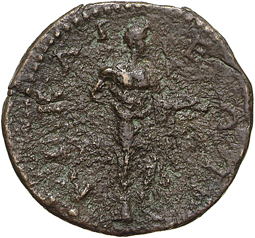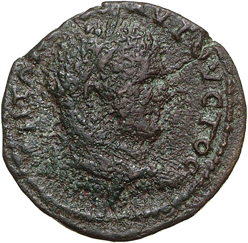 laureate, draped and cuirassed bust of Caracalla, right, seen from rear, holding ? on his extended left hand