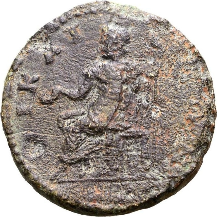 Zeus seated on throne, left, holding patera and long sceptre