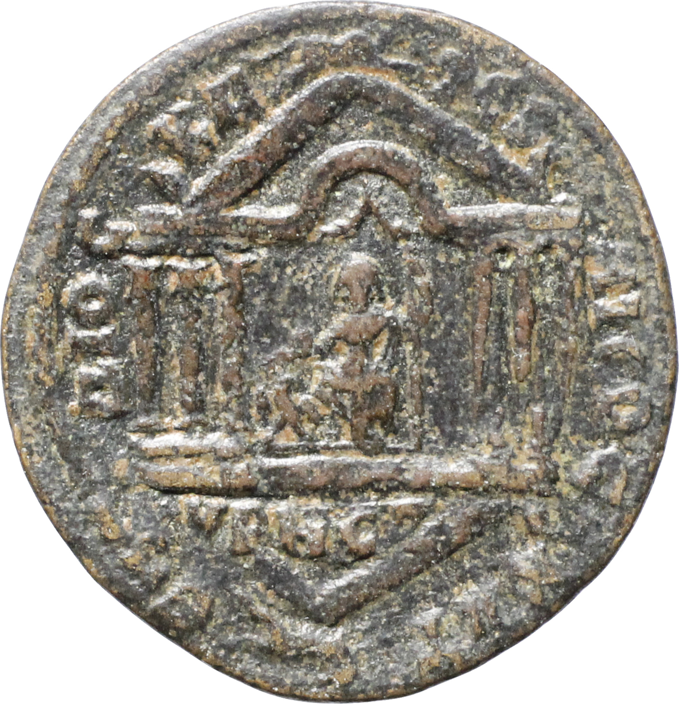 temple with six columns enclosing Zeus seated facing, holding sceptre and thunderbolt, eagle at feet, garlands or curtains above; above temple, bull (?) leaping right |