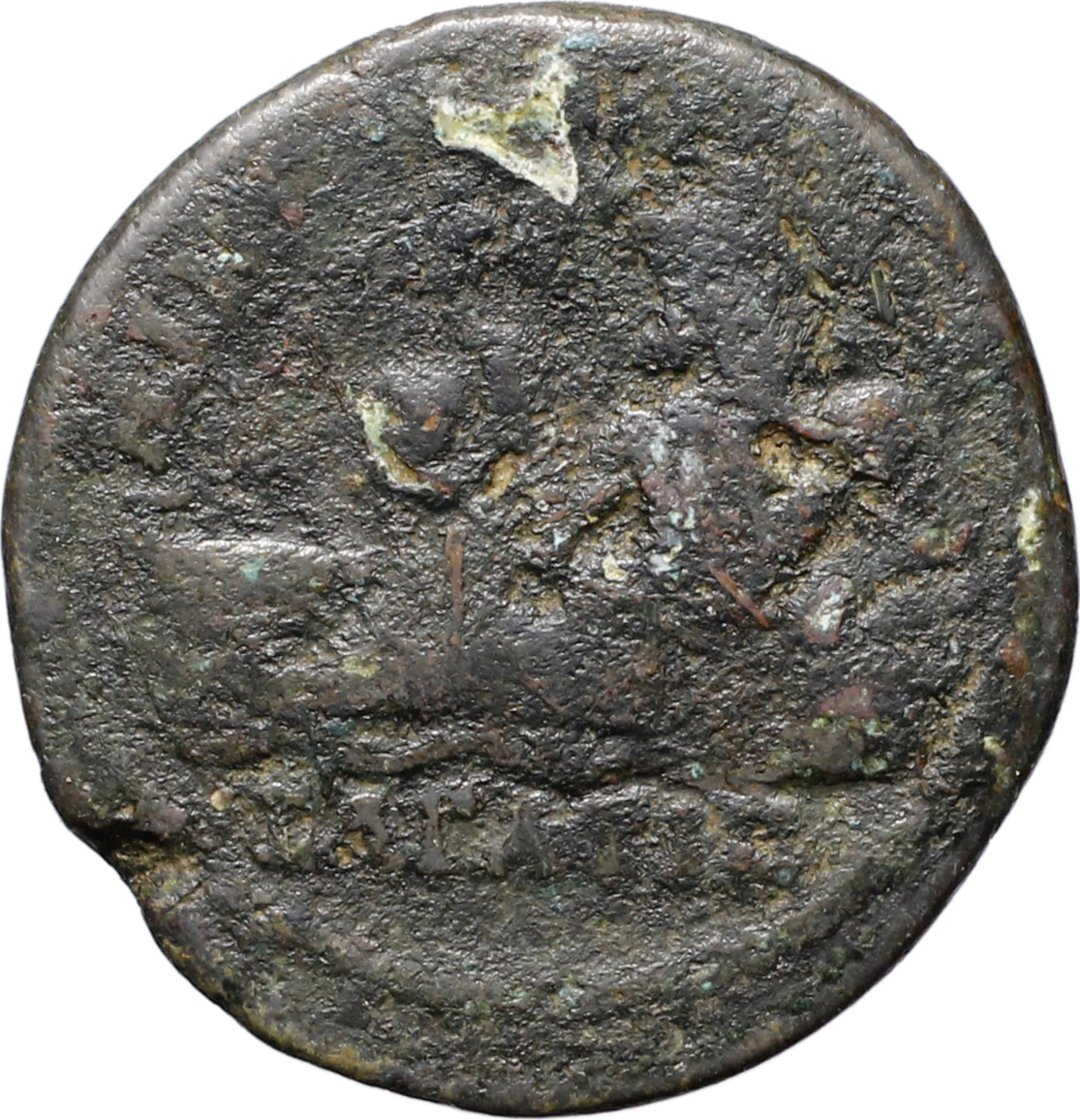 river god Sagaris reclining left, head right, holding laurel branch in his right hand and reed on his left arm set on urn from which water flows; at his feet, prow