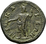 Sarapis standing facing, head left, holding ears of corn in his right hand and resting with his left on sceptre