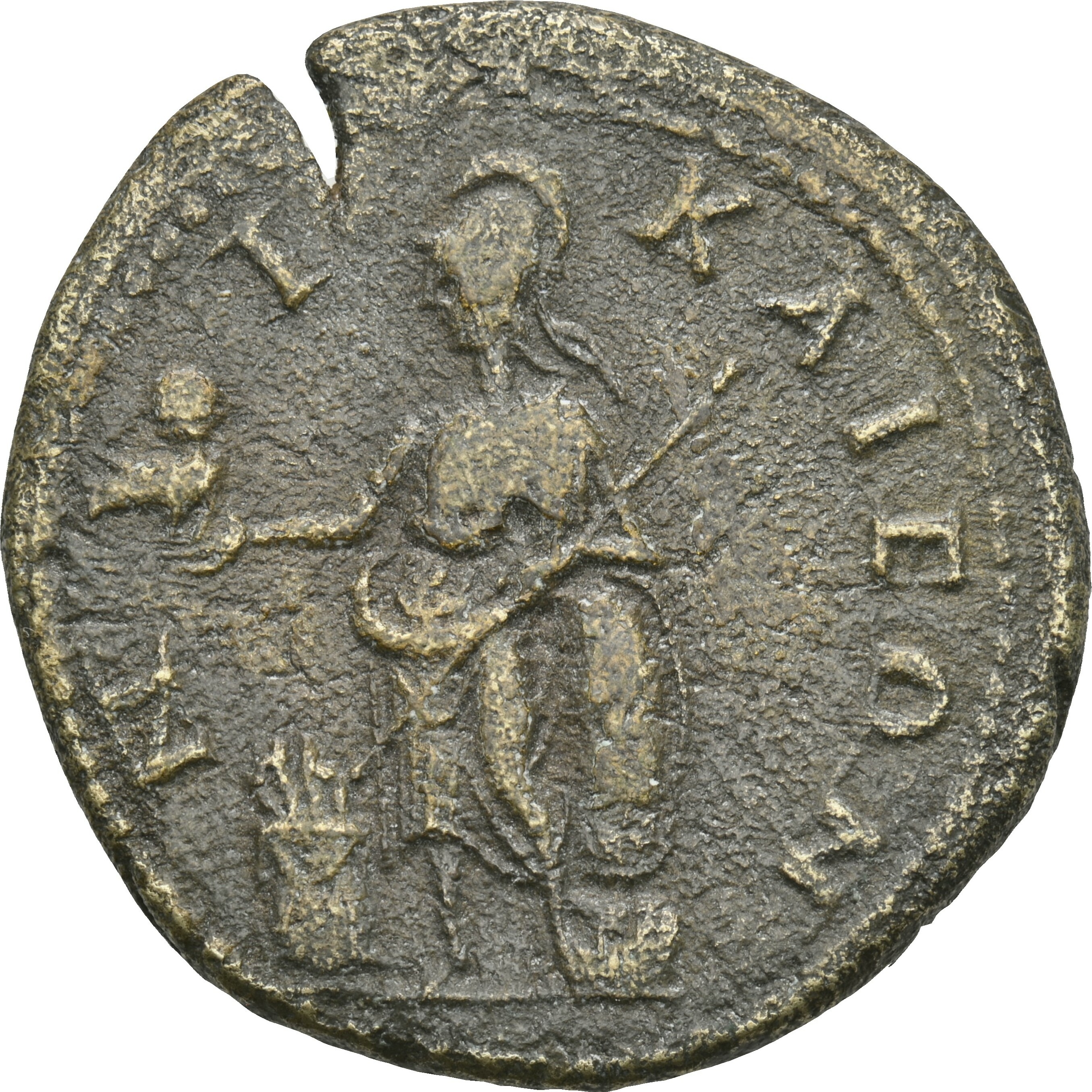 Athena standing facing, head left, holding owl over flaming altar and transverse spear on her left arm while resting her left elbow on long oval shield set on globe