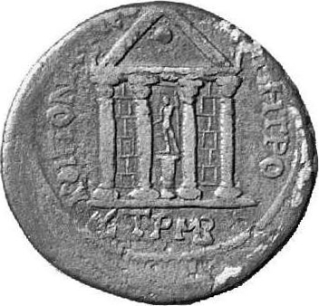 temple with four columns with wall within intercolumnations and statue of Ma/Zeus on pedestal, looking left, in the centre; pellet in pediment