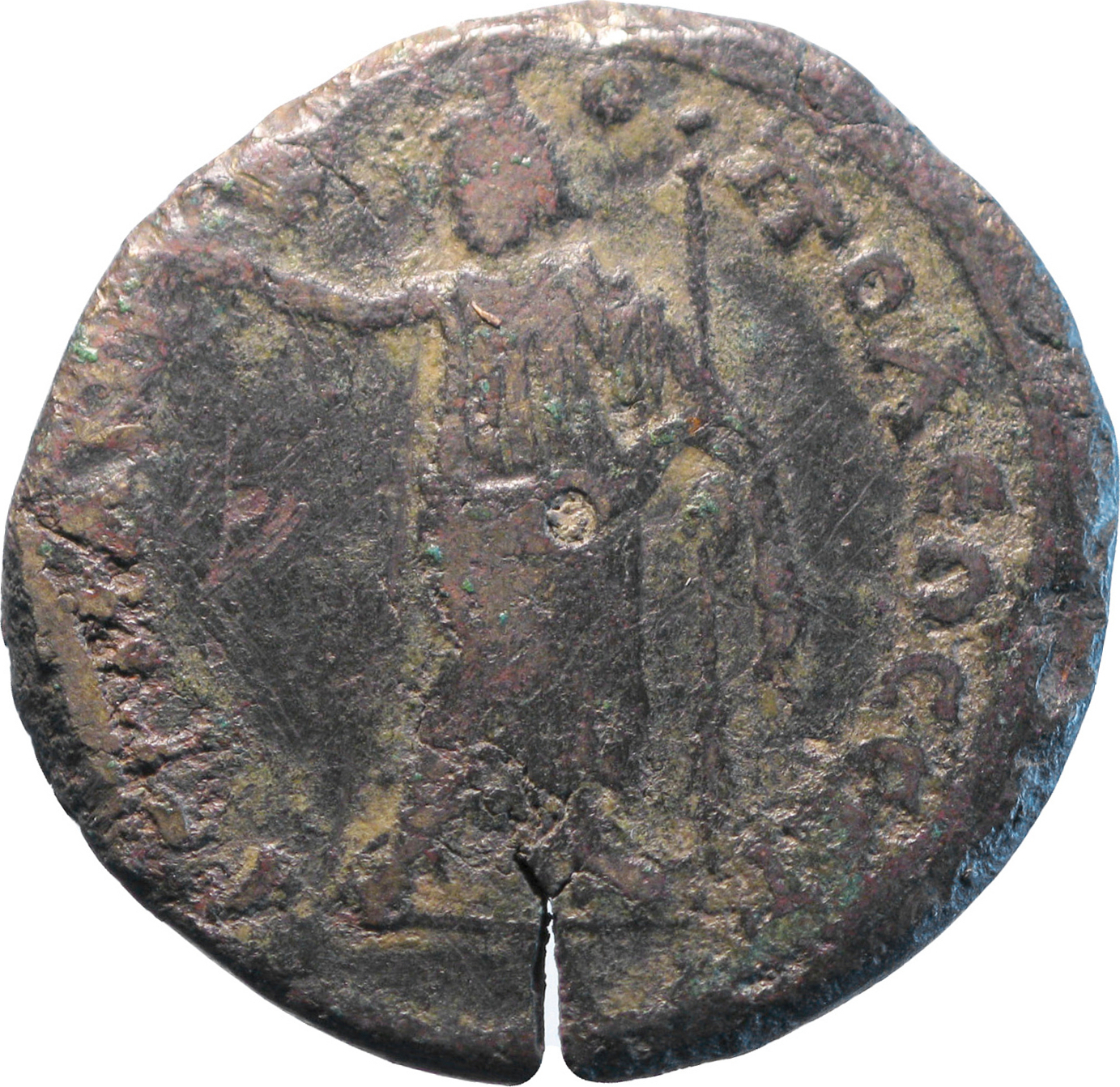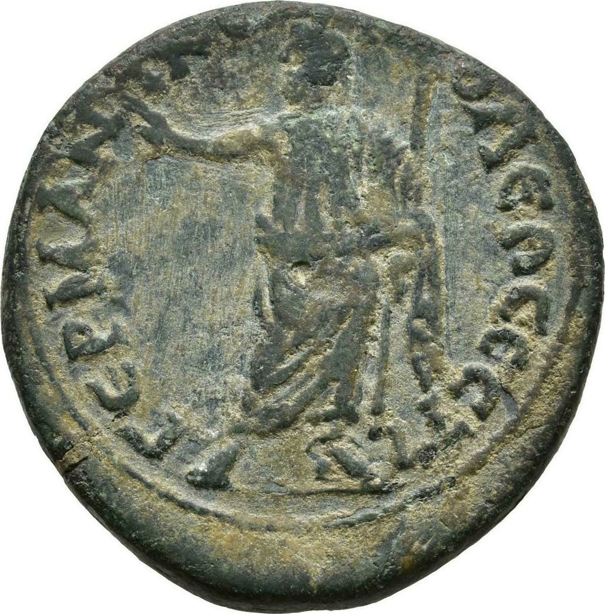 Sarapis with kalathos and peplos standing facing, head left, his right hand extended, holding sceptre in left