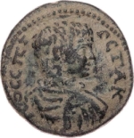 bare-headed, draped and cuirassed bust of Geta, right, seen from rear