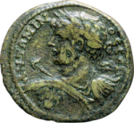 laureate, draped and cuirassed bust of Caracalla, left, seen from rear, holding spear pointed forward and shield decorated with gorgoneion