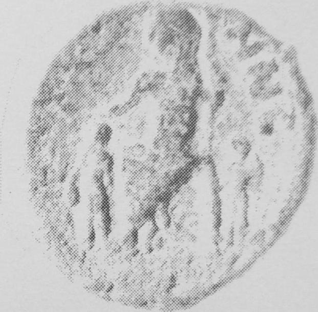 Leto seated left, holding long sceptre in left hand, right arm above small Apollo holding branch(?) in right hand; to right, small Artemis standing facing, holding quiver in right hand