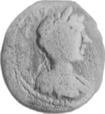 Leto seated left, holding long sceptre in left hand, right arm above small Apollo holding branch(?) in right hand; to right, small Artemis standing facing, holding quiver in right hand