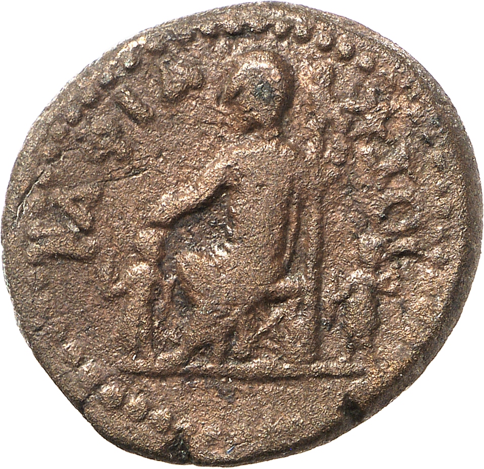 Leto seated left, holding long sceptre in left hand, right arm above small Apollo holding branch(?) in right hand; to right, small Artemis standing facing, holding quiver in right hand; star or C in upper right field before date