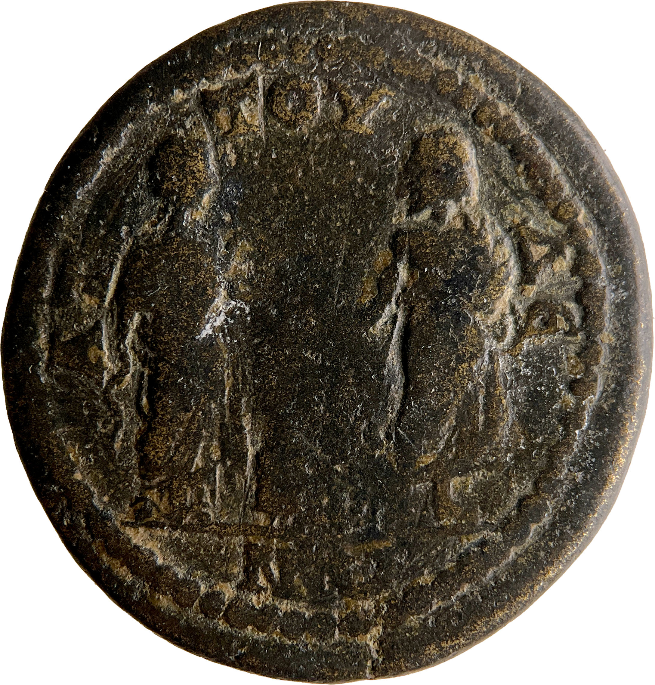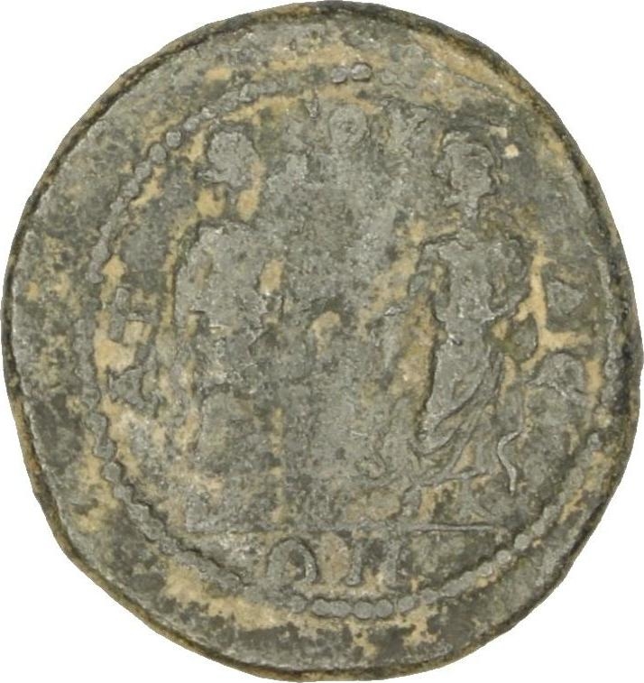 Hygieia standing right, feeding serpent from patera, facing Asclepius standing facing, head left, his left hand at his hip, resting with right on serpent-staff, Telesphorus standing facing between them