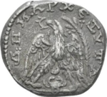 eagle standing facing, head and tail left, with wings spread, holding wreath in beak; between legs, crescent over crab; date palm to right