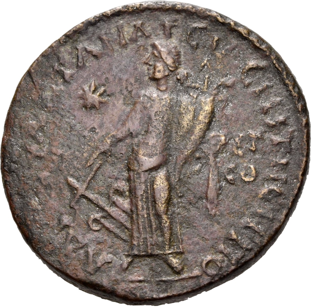 Tyche standing facing, head left, holding rudder in right and cornucopia in left; in left field, star |