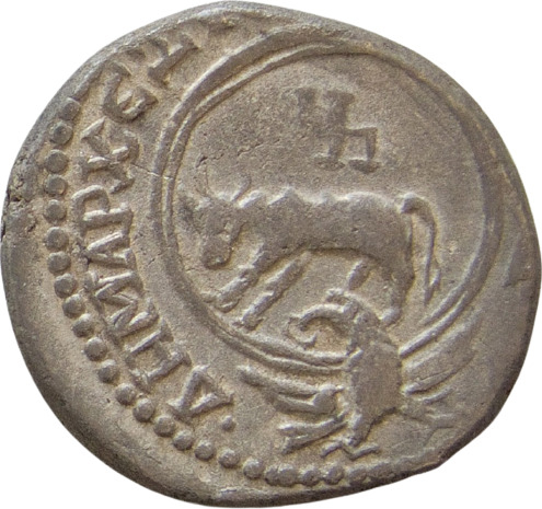 heifer (Io) left under Marnas symbol, within wreath above eagle standing facing, head and tail left, with wings spread, holding wreath in beak