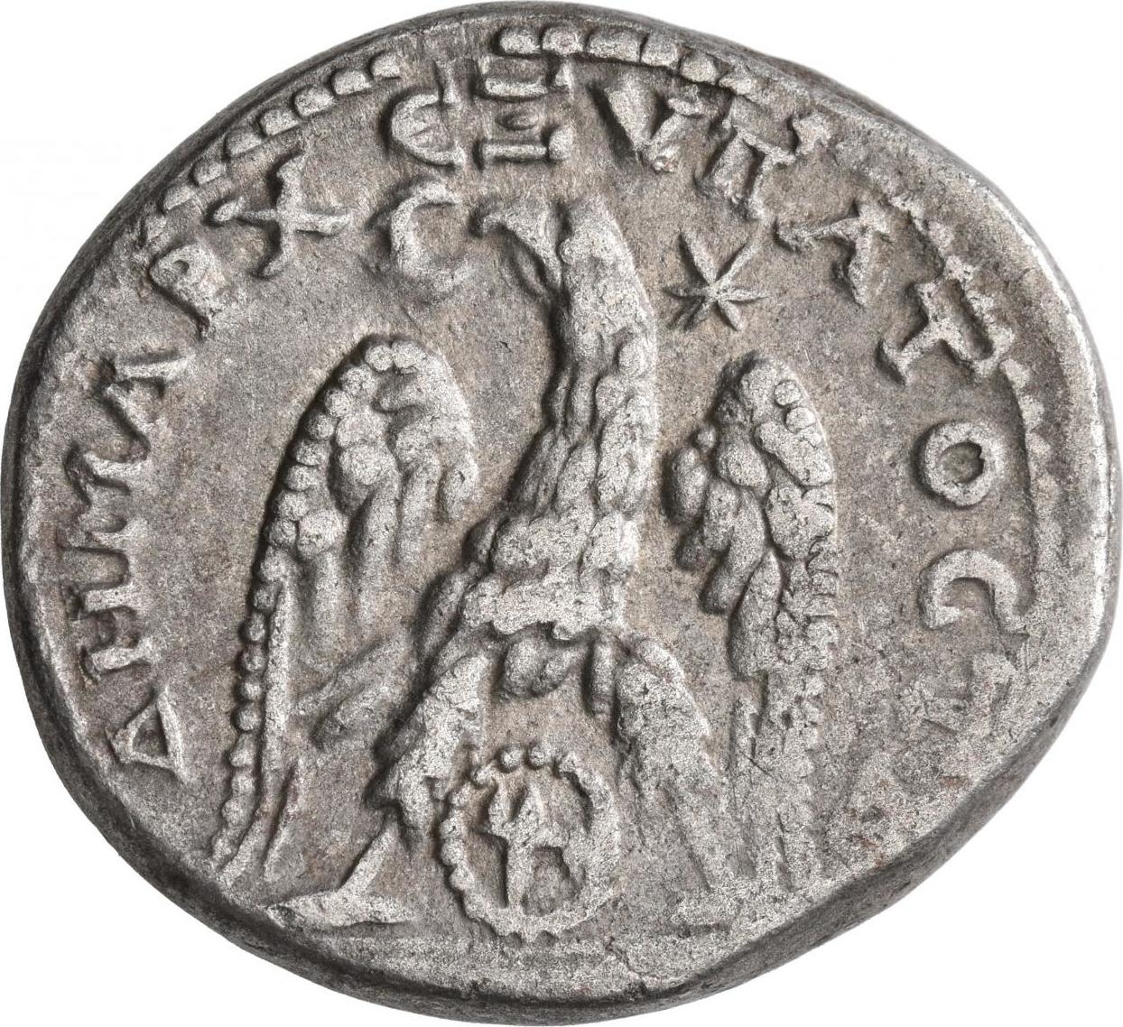 eagle standing facing, head and tail left, with wings spread, holding wreath in beak; between legs, Marnas symbol in circle of pellets; in upper right field, six-pointed star