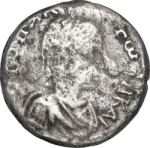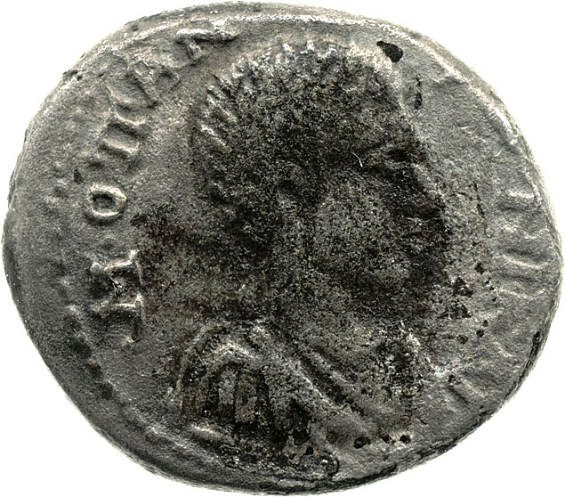 bare-headed, draped and cuirassed bust of Diadumenian, right, seen from front