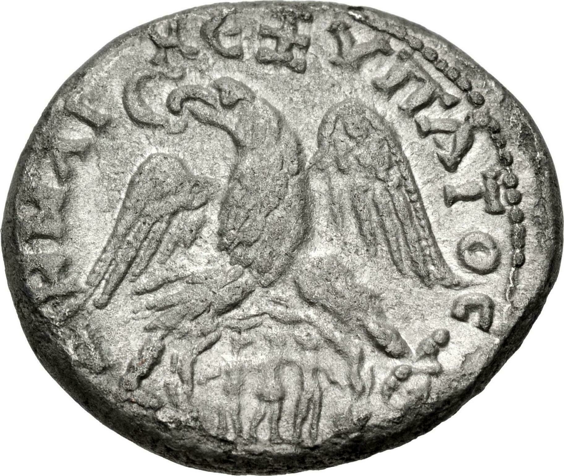 eagle standing facing, head and tail left, with wings spread, holding wreath in beak; between legs, the three Charites within wreath