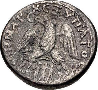 eagle standing facing, head and tail left, with wings spread, holding wreath in beak; between legs, the three Charites within wreath