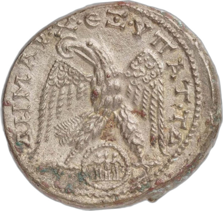 eagle standing facing, head and tail left, with wings spread, holding wreath in beak; between legs, the three Charites within wreath