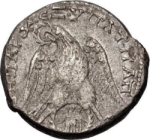 eagle standing facing, head and tail left, with wings spread, holding wreath in beak; between legs, the three Charites within wreath |