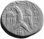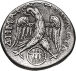 eagle standing facing, head and tail left, with wings spread, holding wreath in beak; between legs, the three Charites within wreath