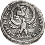 Mount Gerizim surmounted by temple and altar to right, colonnade at base, within wreath above eagle standing facing, head and tail left, with wings spread, holding wreath in beak; lighted altar between eagle's legs