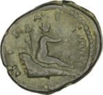 infant Dionysus seated in a basket right, his arms extended; behind him, thyrsus