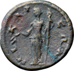Demeter standing facing, head left, holding ear of corn in her right hand and resting on torch with her left