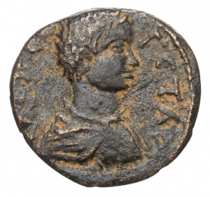 bare-headed, draped and cuirassed bust of Geta, right, seen from rear