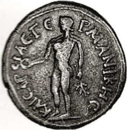 Apollo standing left, holding patera and branch