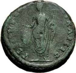 togate female figure (?) standing facing, head left, holding out hand and short sceptre