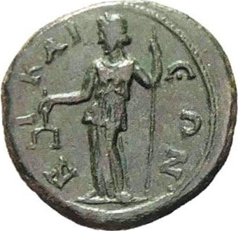 Dikaiosyne standing, facing, head, left, holding scales and long sceptre