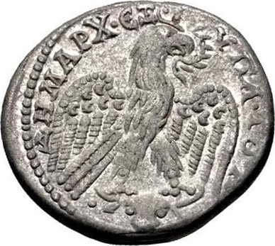 eagle seen from front, with wings spread, head right, wreath in beak, standing on facing long-horned bull's head, to left and right of which, pellets