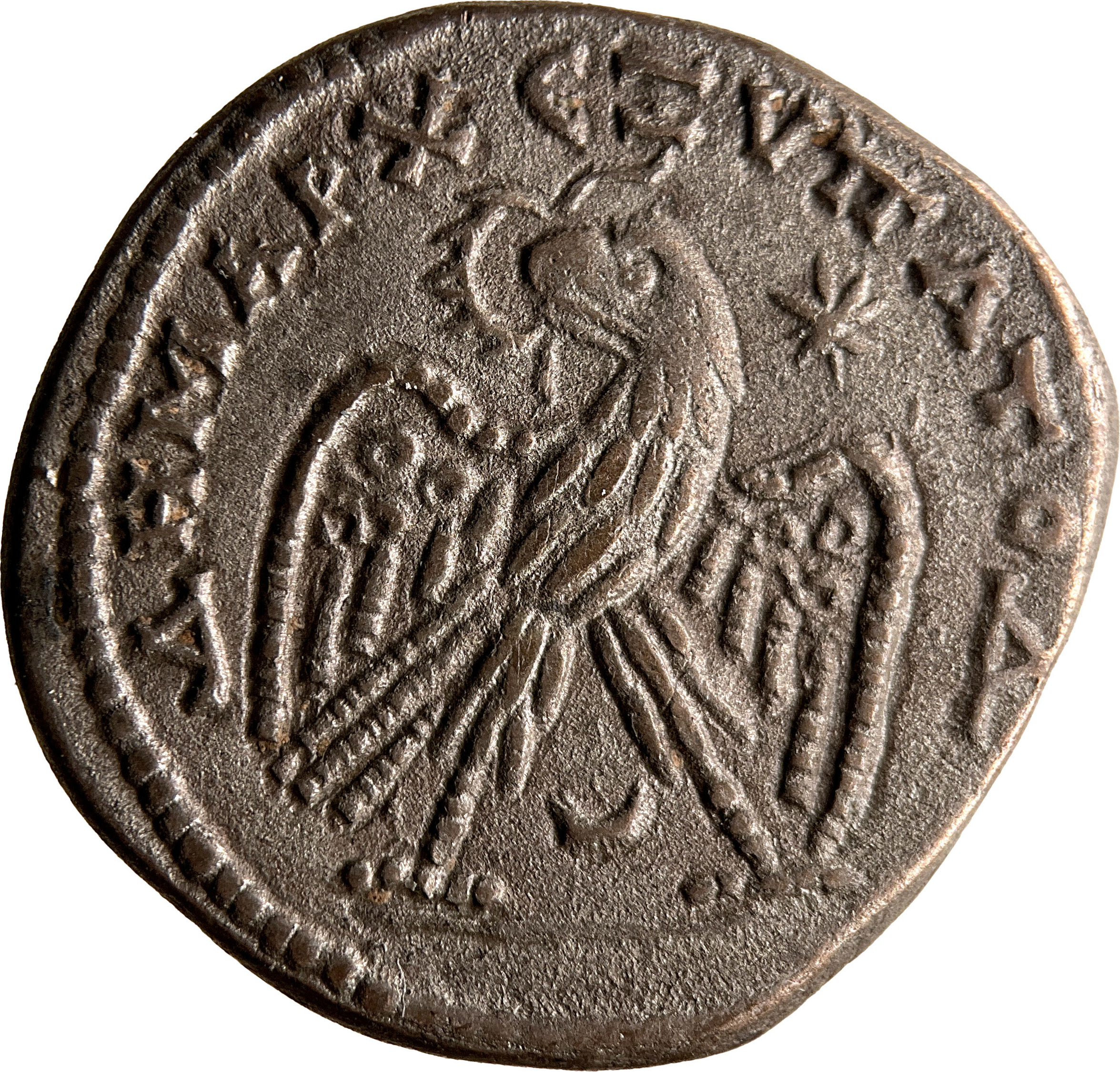 eagle seen from front, with wings spread, head left, wreath in beak; between legs, crescent; star in upper right field