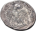 eagle seen from front, with wings spread, head right, wreath in beak; between legs, crescent; star in upper left field; two pellets in exergue