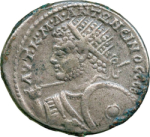 radiate and cuirassed bust of Caracalla, left, seen from front, his right hand holding sceptre over right shoulder, shield with over left shoulder