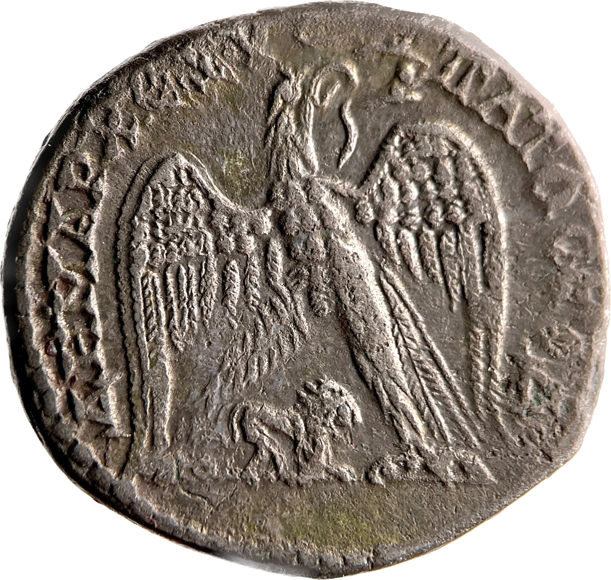 laureate and cuirassed (with gorgoneion) bust of Caracalla, left, seen from front, holding sceptre over shoulder in right hand, large shield suspended by baldric over left shoulder; shield is decorated with a half-length figure of the bearded Apollo of Hierapolis, wearing kalathos, holding serpent-entwined spear in right hand and flower in left, set on a pedestal decorated with two eagles |
