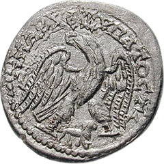 eagle standing facing, wings spread, head left, wreath in beak; between legs, lion walking right