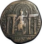 Sarapis seated facing on throne, head left within a arch with four columns, his right hand extended over Cerberus standing at his side, his left resting on sceptre |